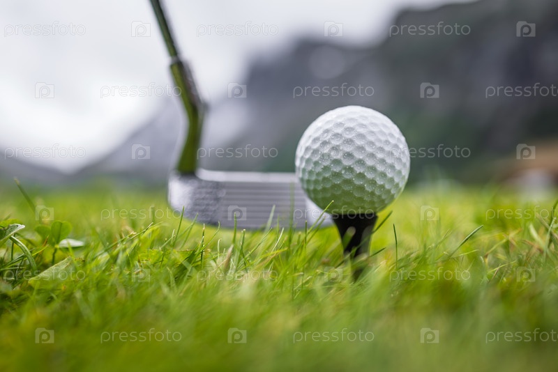 Гольф-клуб и мяч на мокром зеленом поле с горами на заднем плане