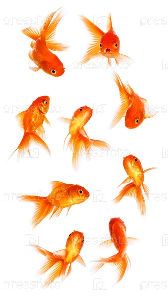 Группа золотых рыбок на белом фоне изолирована