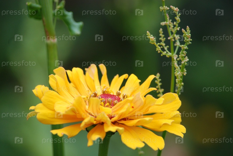 Цветок относится к роду однолетних и многолетних трав и подкустарников семейства Астерацеи.Растение имеет среднеразмерный соцвет с желтыми лепестками и красным ядром
