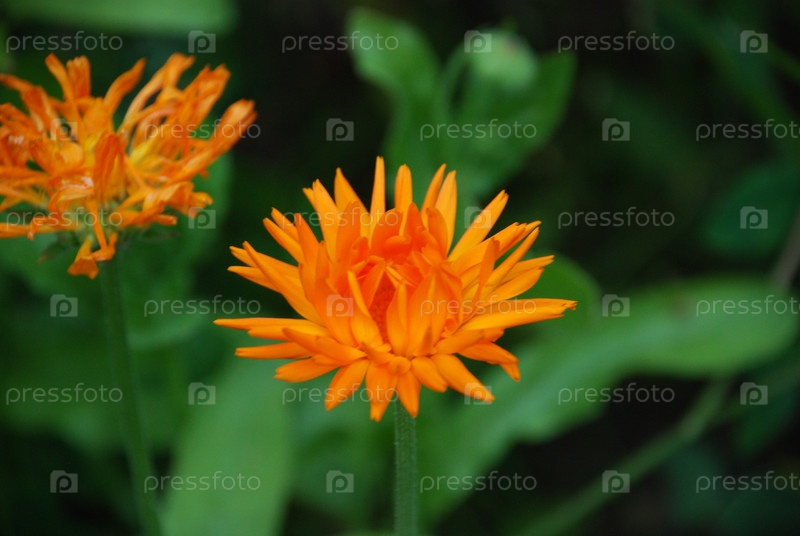 Календула терри или ромашка. травянистое лекарственное растение из вида календулы семейства астерацев. Цветы среднего размера с тонкими длинными апельсиновыми лепестками и оранжевым ядром. Зеленая трава растет вокруг