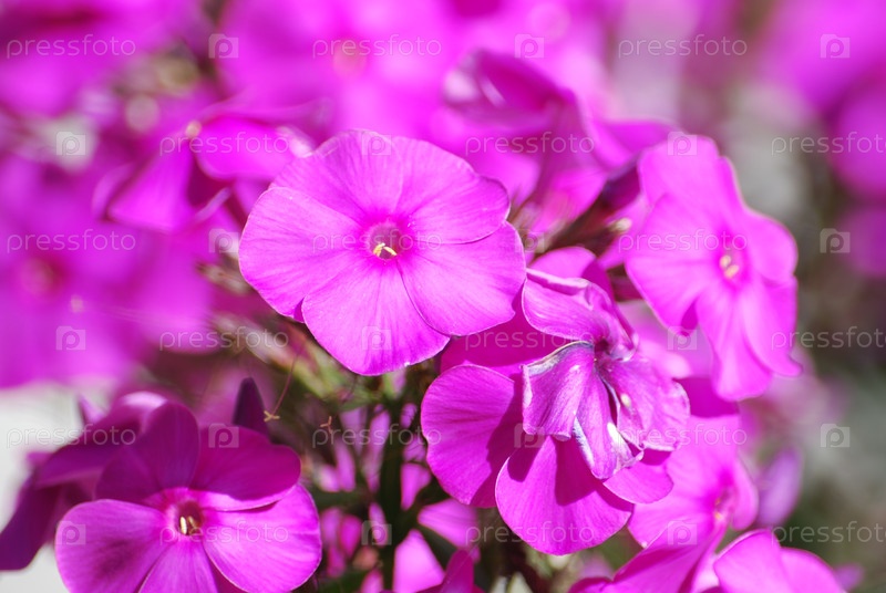 Розовый флокс в саду. Маленькие розовые цветы выросли и расцвели на длинном зеленом стебле. У них пять трапецинообразных лепестков. Лепестки слегка белые ближе к центру, а пистили желтые