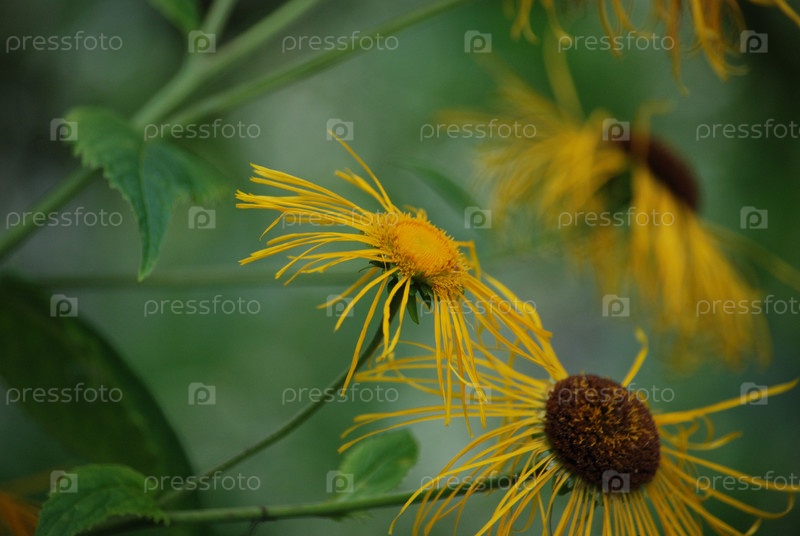 Желтые цветы элекампаны.Цветок относится к роду многолетних растений семейства Астераceae.У него широкое желтое или коричневое ядро и длинные тонкие жёлтые листочки.Вокруг зелёных листьев растения