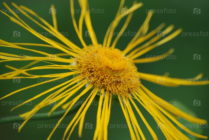 Желтые цветы элекампаны.Цветок относится к роду многолетних растений семейства Астераceae.У него широкое желтое или коричневое ядро и длинные тонкие жёлтые листочки.Вокруг зелёных листьев растения