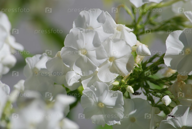 Белый флокс в саду. Маленькие белые цветы выросли и расцвели на длинном зеленом стебле. У них пять лепестков в форме трапеции. Они имеют желтые пистили. Рядом растут несколько цветов