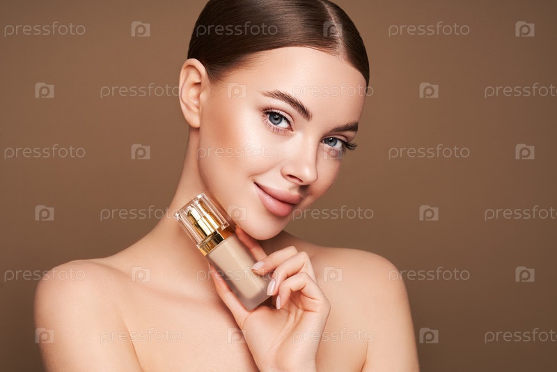 Портрет красивой молодой женщины с бутылкой основания