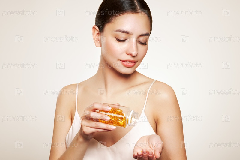 Красивая девушка с таблеткой с маслом печени трески Омега-3