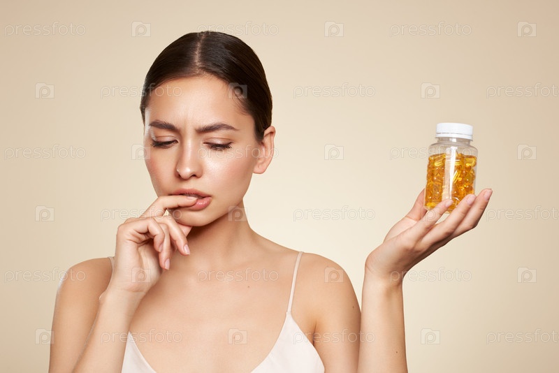 Красивая девушка с таблеткой с маслом печени трески Омега-3