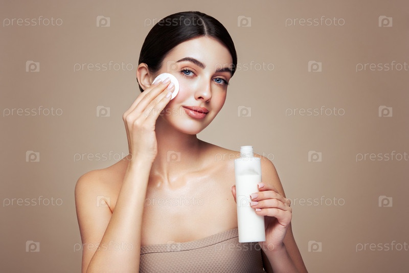 Молодая женщина очищает лицо косметическим молоком