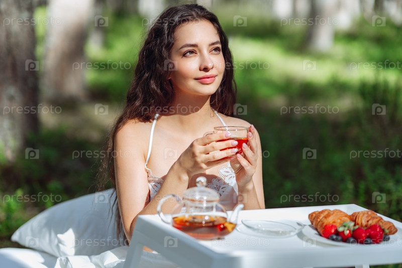 Молодая женщина завтракает в постели в летнем лесу