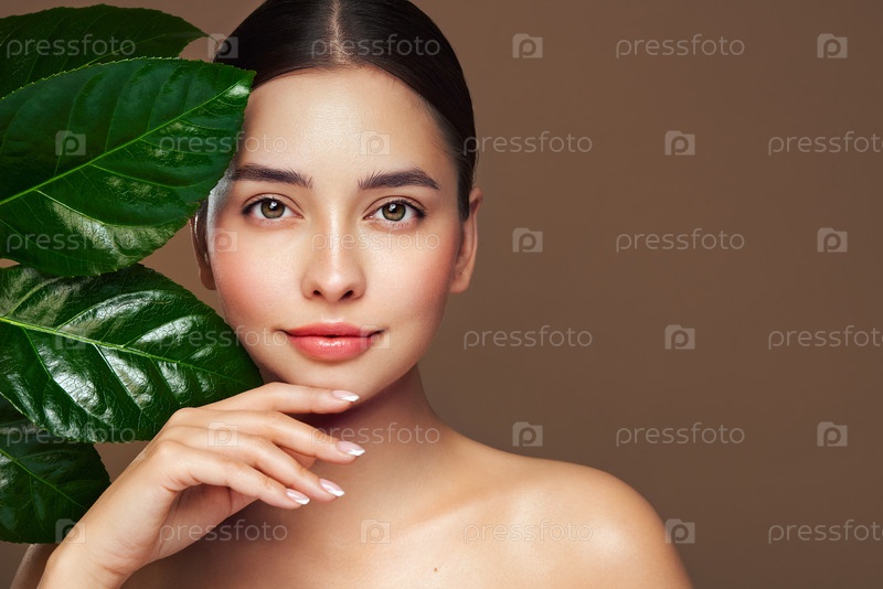 Закройте женское лицо с зеленым экзотическим листом