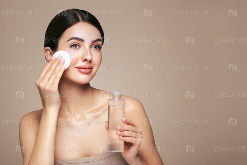 Молодая женщина очищает лицо косметическим молоком