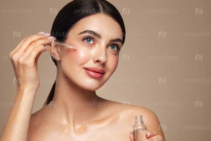 Молодая красивая женщина наносит сыворотку для лица