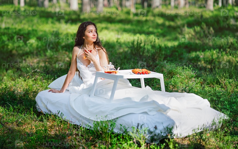 Молодая женщина завтракает в постели в летнем лесу