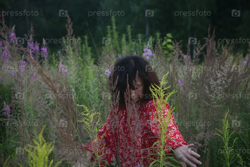 Молодая женщина в яркой одежде гуляет в лесу