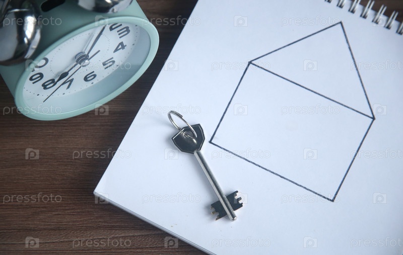 Ключи рядом с нарисованным домом и будильником, крупный план