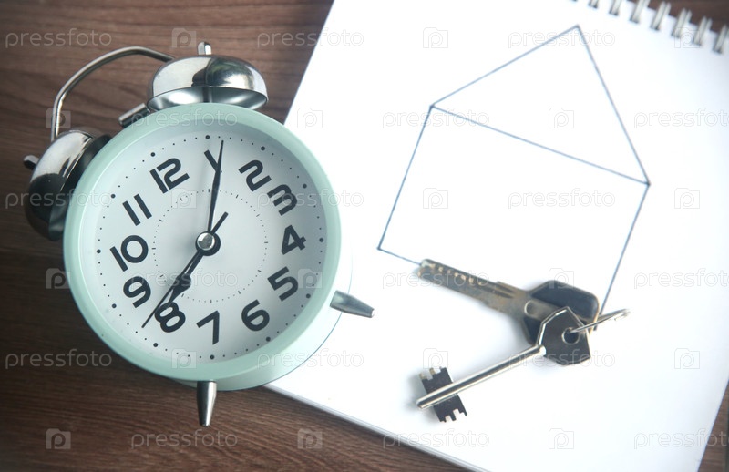 Ключи рядом с нарисованным домом и будильником, крупный план