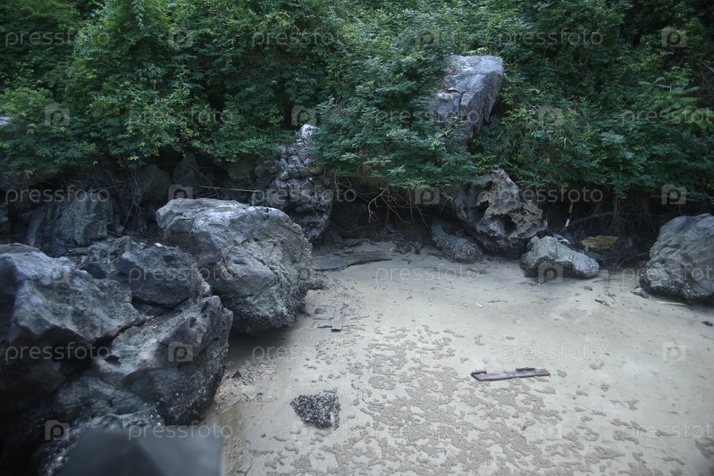 Пейзаж с видом на деревья, скалы с камнями и песок