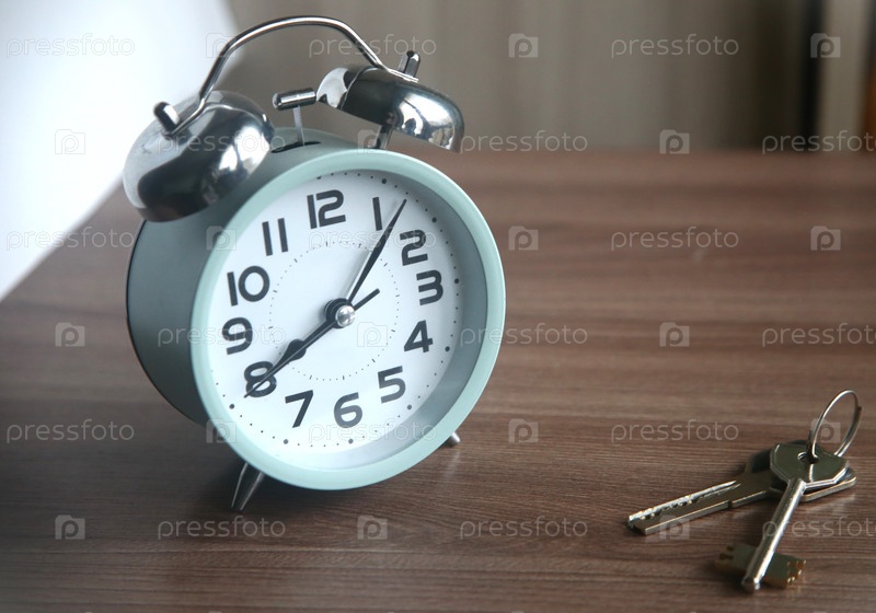 Часы будильник рядом с ключами лежат на столе, крупный план