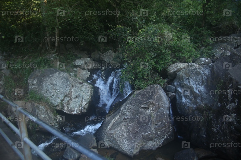 Пейзаж с видом на деревья, скалы с камнями и водопад