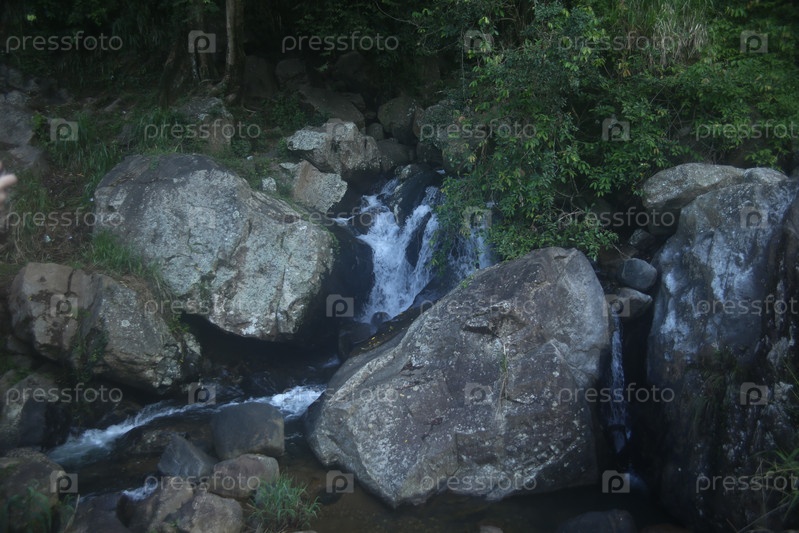 Пейзаж с видом на деревья, скалы с камнями и водопад