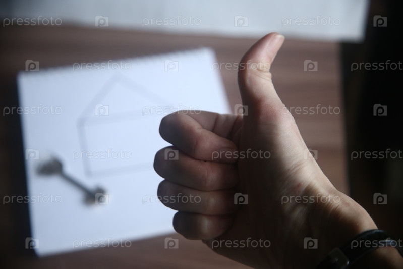 Рука показывает класс на фоне ключа от квартиры, крупный план