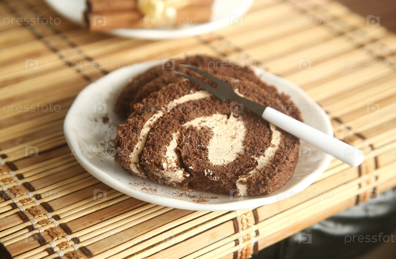 шоколадный вкусный рулет с чашкой кофе и корицей на кухонном столе. вид сверху