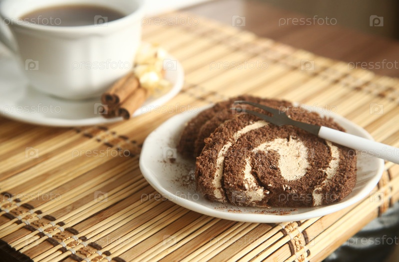 Шоколадный рулет с кофе и корицей на столе