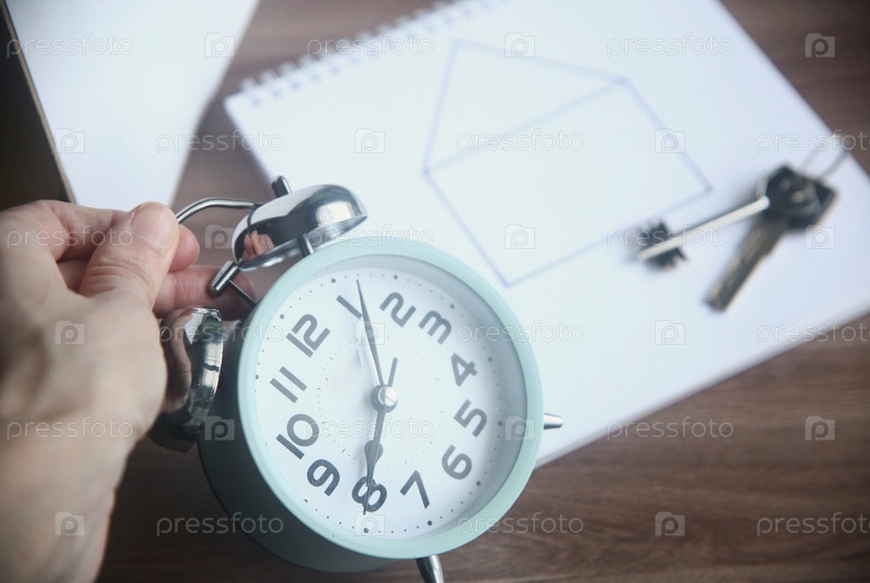 Женская рука держит будильник на фоне Ключей и нарисованного дома, крупный план