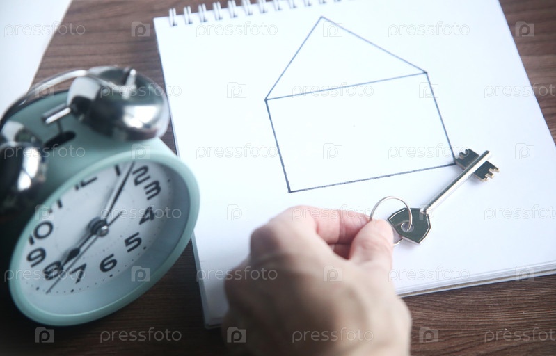 Рука женщины держит ключ на блокноте с нарисованным домом, крупный план