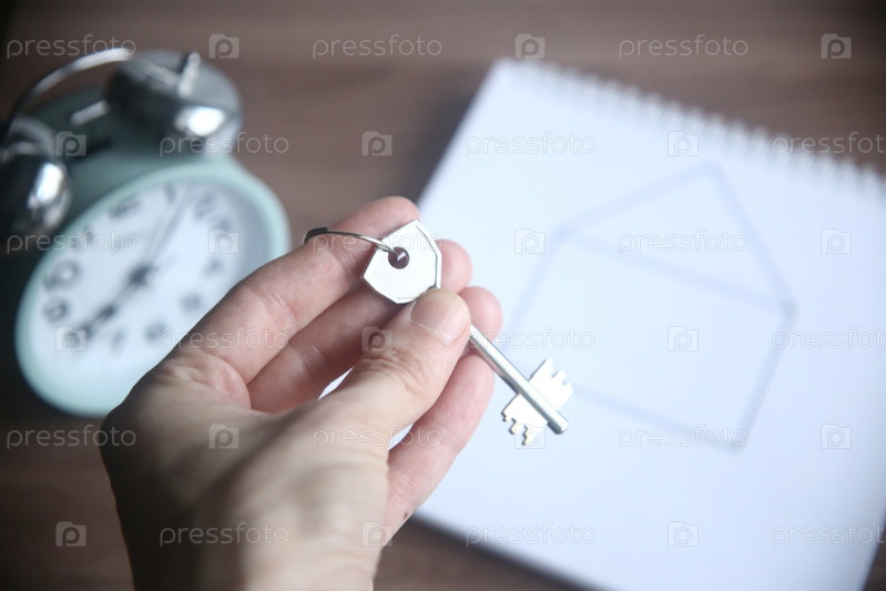Рука женщины держит ключ от квартиры на фоне блокнота и часов, крупный план