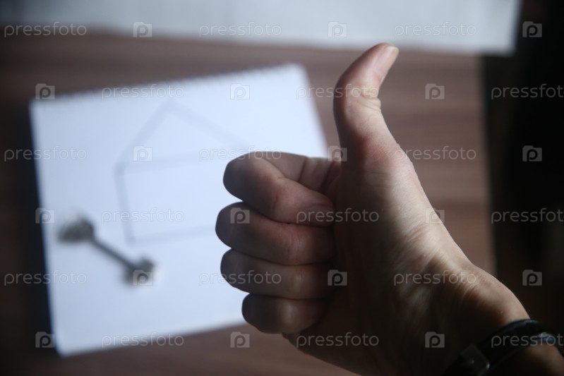 Рука женщины показывает знак классно на фоне ключа и блокнота, крупный план