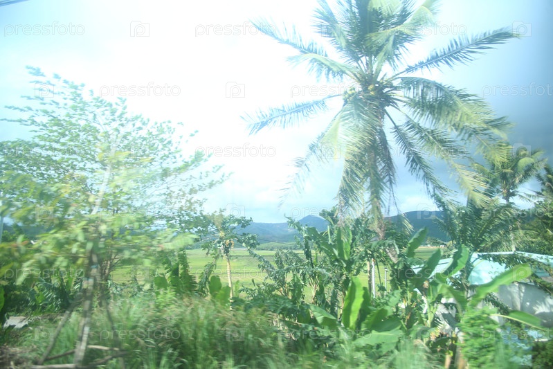 Пейзаж с видом на деревья пальмы, зеленые растения и синее небо