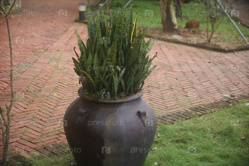 Зеленое растение щучий хвост в горшке на дороге крупным планом