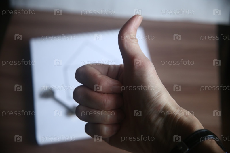Рука женщины показывает знак классно на фоне ключа и блокнота, крупный план