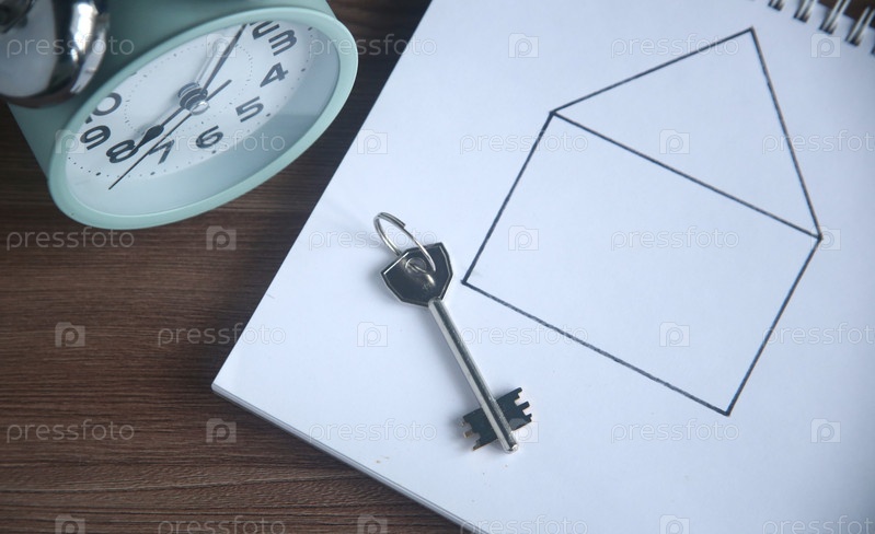 Ключи рядом с нарисованным домом и будильником, крупный план