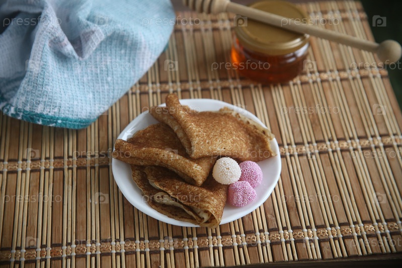 Румяные и вкусные блины на тарелке с медом, крупный план