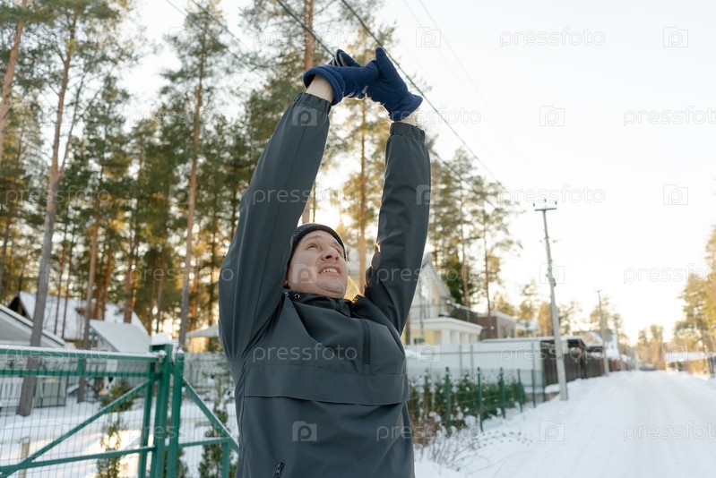 Сорокалетний спортсмен протягивает руки наружу, чтобы согреться в холодное утро и сконцентрироваться на гибкости рук и плеч перед бегом