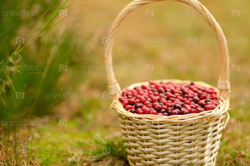 Осенняя лесная корзина заполнена спелыми клюквами