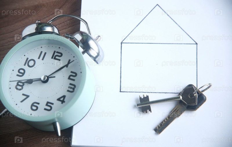 Ключи рядом с нарисованным домом и будильником, крупный план