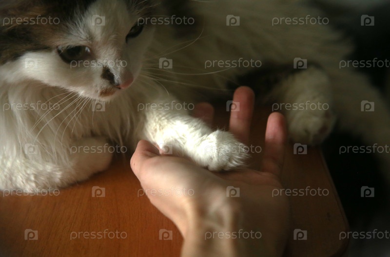 Рука держит лапку кота. Концепция доброты и заботы. Крупный план