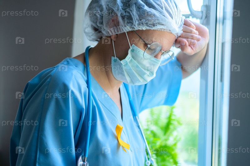 Уставшая женщина-врач с желтой ленточкой осведомленности на униформе глубоко размышляет о плане лечения, показывая тяжелую работу медицинского персонала
