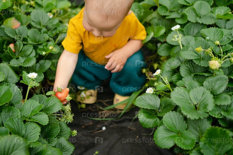 Аэрофотосъемка ребенка, собирающего клубнику для еды