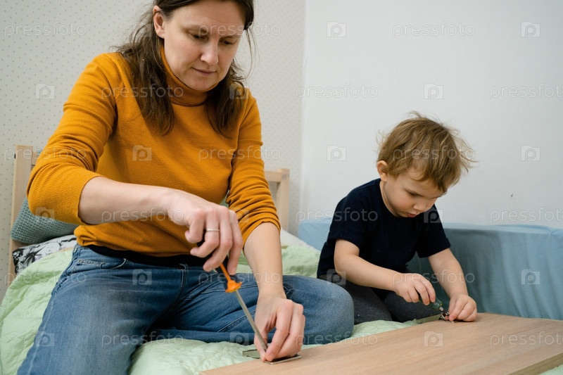 Мама и сын работают в команде, собирая мебель с помощью инструментов