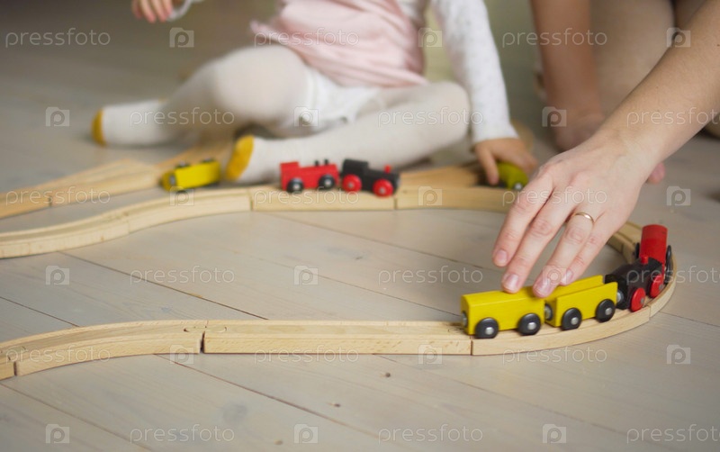 Мать и дочь играют вместе с игрушками в помещении дома.Мама помогает своей девочке.Концепция семейного образа жизни