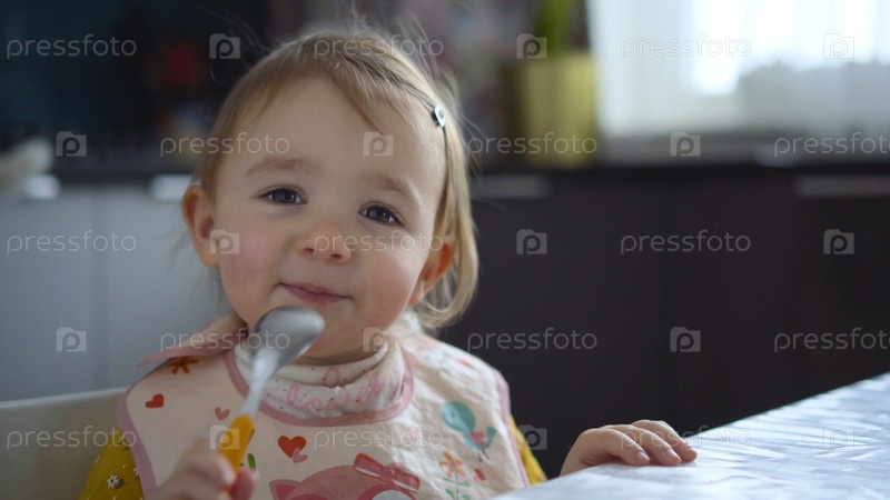 Маленькая девочка сама ест здоровую пищу