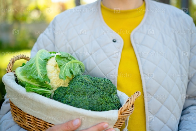 Молодая фермерка держит корзину из цветной капусты и брокколи. сезон сбора урожая, домашние овощи, богатая клетчаткой пища, здоровая диета и творческие рецепты питательных блюд