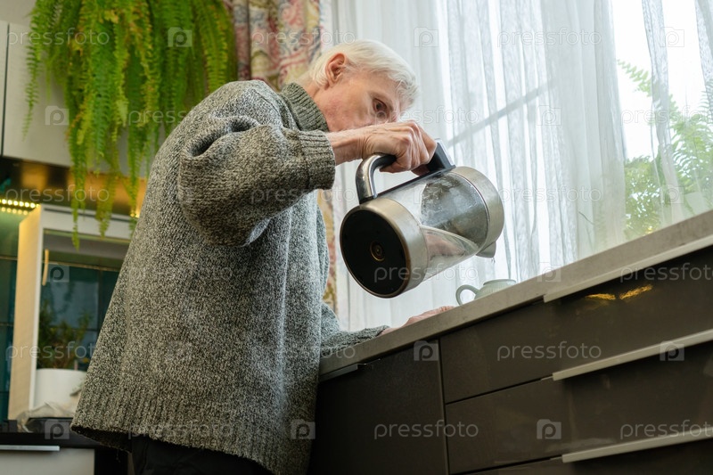 Пожилой мужчина наливает горячую воду из чайника в чашку или чайник.Действие является частью ежедневной рутины чая, демонстрирующей независимость.Дедушка занимается кухонной работой