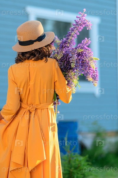 Девушка в соломенной шляпе держит букет люпина в руках