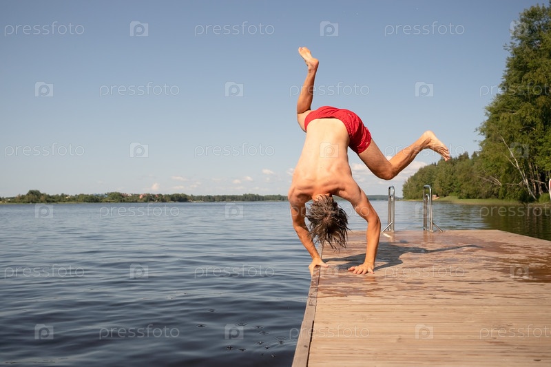 Атлетический мужчина ныряет головой с пирса в озеро.Летний день, сильное движение и энергия