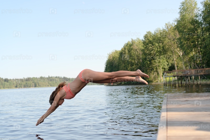 Здоровая женщина ныряет головой с пирса в озеро.Здоровое тело, сильные движения, естественная летняя активность